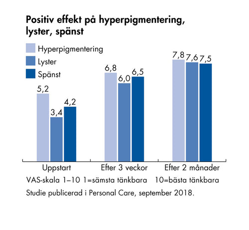 Genom att tillföra näring och viktiga fettsyror till hudbarriären, helst både inifrån och utifrån, får huden ökad motståndskraft mot yttre påverkan och motverkar överaktiv melaninproduktion.